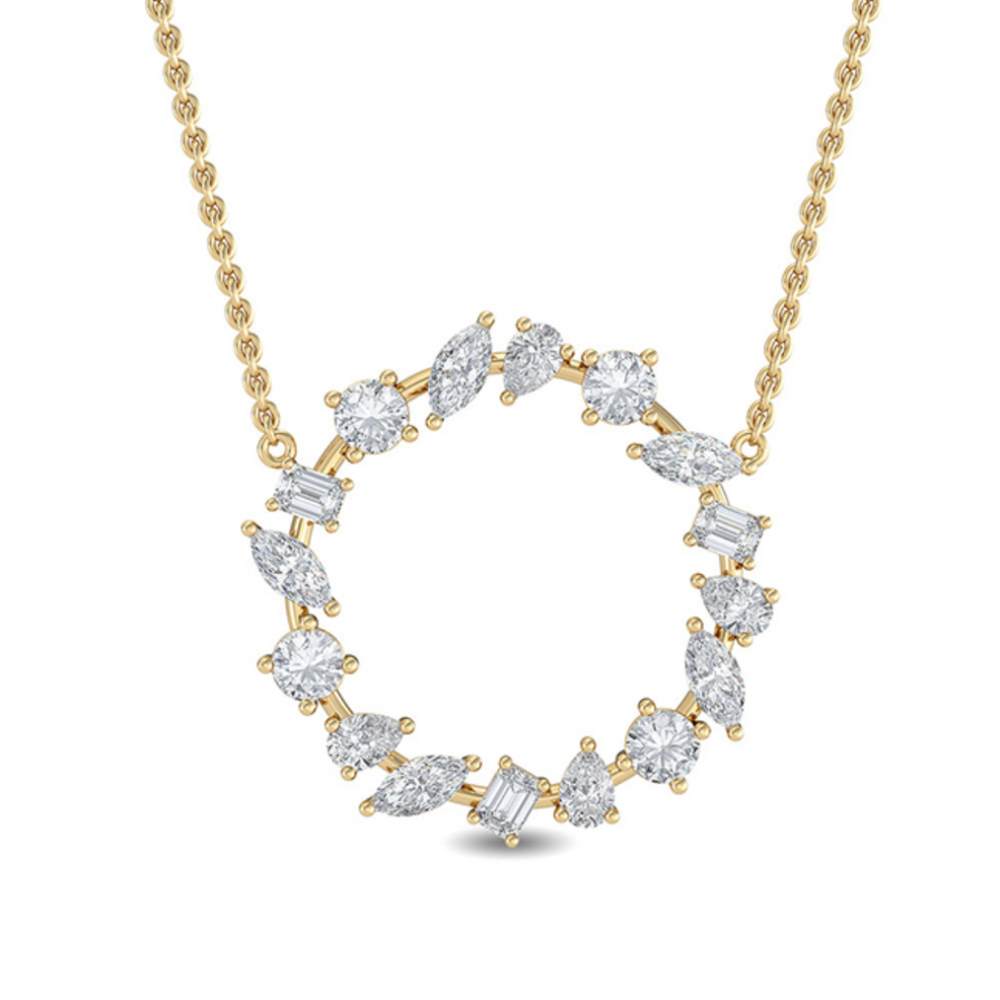A stunning pendant that encapsulates elegance and tranquility. Featuring beautiful fancy cut lab grown diamonds set in a circle, enhancing its brilliance. The perfect accessory for any occasion. Whether worn alone or layered with other pieces, it radiates a timeless charm that will captivate hearts.